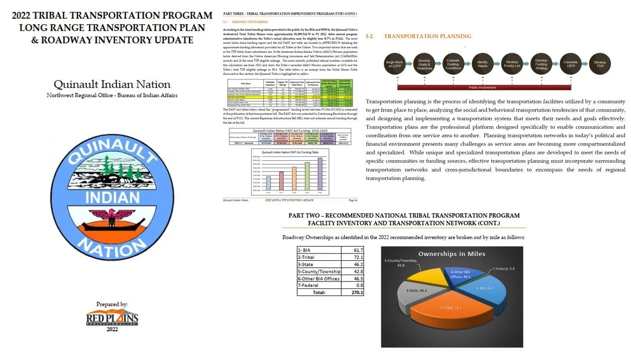 Red Plains has been honored to serve the Quinault Nation under an on-call contract for over a decade, fostering a deep working relationship with tribal leadership, various departments, and community members. Throughout this partnership, our multidisciplinary team has contributed to the Nation’s growth and resilience by completing two Master Plans, over 20 engineering projects, multiple transportation and traffic analyses, and maintaining the Tribe’s Long-Range Transportation Plan (LRTP) and National Tribal Transportation Facility Inventory (NTTFI) updates. Additionally, we have worked closely with the Tribe’s Planning and Natural Resources Departments to expand and maintain their GIS systems.